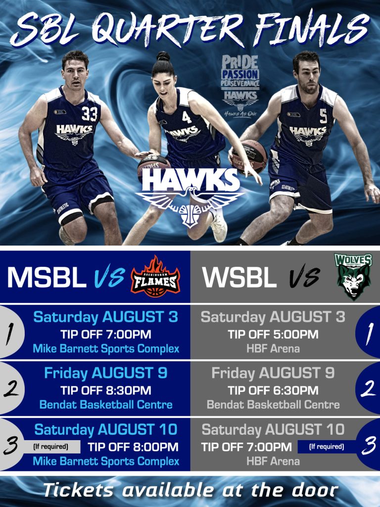 Hawks Quarter Finals Fixtures View all sponsors Become a sponsor Related Posts 27/08/2024 WABL Finals Week 1 Wrap Read more 02/08/2024 NBL1 West Women through to Preliminary Final Saturday Night against Cockburn Read more 31/07/2024 Parking at Bendat on Thursday and Friday Read more 27/07/2024 Hawks Women into the Semi-Final Thursday Night at Bendat Read more
